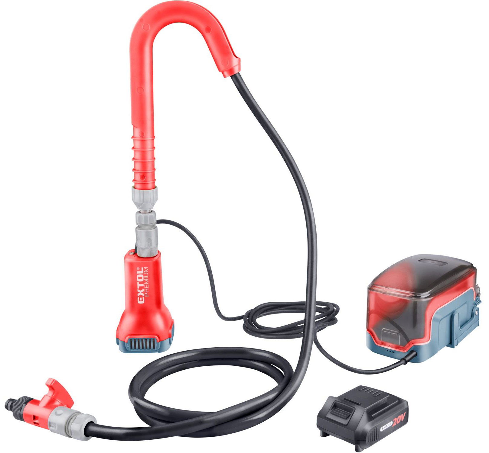 - Az Extol® Premium 8891930 akkus szivattyúhoz 2000 mAh kapacitású 20 V-os Li-ion akkumulátor, és 2,4 A töltőáramú akkumulátortöltő is tartozik.