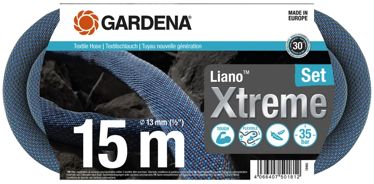 FőkategóriákGardena Liano™ Xtreme textil tömlő készlet, 13 mm (1/2"), 35 bar, 15 m/tekercs